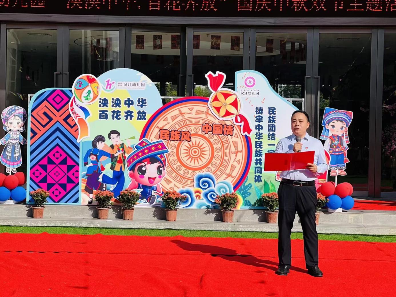 汉江教育党总支书记陈伟致辞。他围绕“铸牢中华民族共同体意识”的主题,结合国庆中秋双节的特殊意义,阐述了开展民族团结教育对幼儿成长的重要性。他希望汉江幼儿园要继续深化家园共育,通过丰富多彩的活动,让民族团结的种子在孩子们心中生根发芽,共同维护民族团结,共创美好未来。