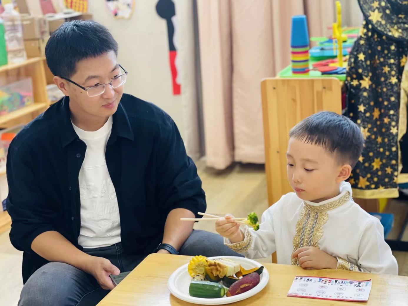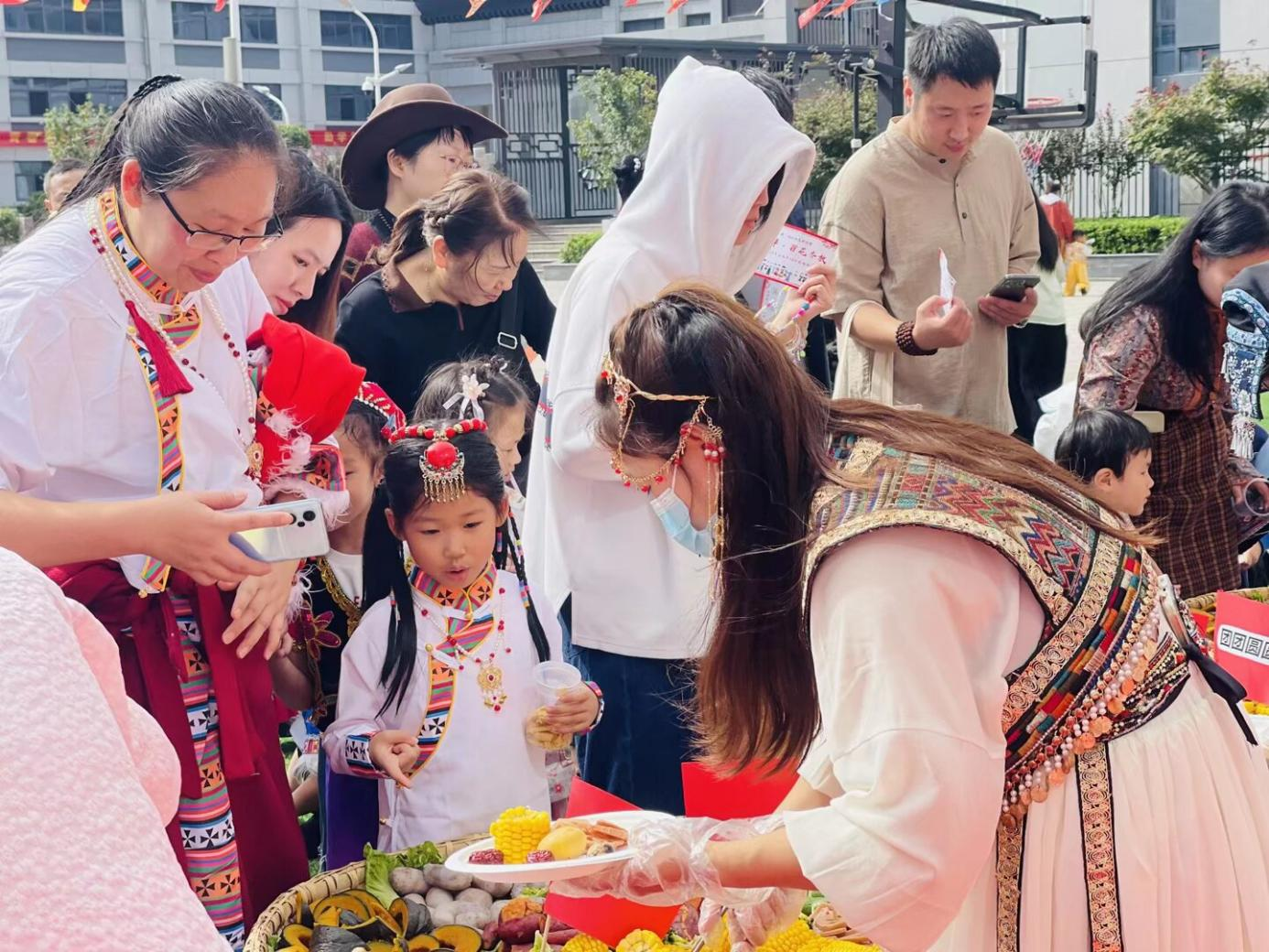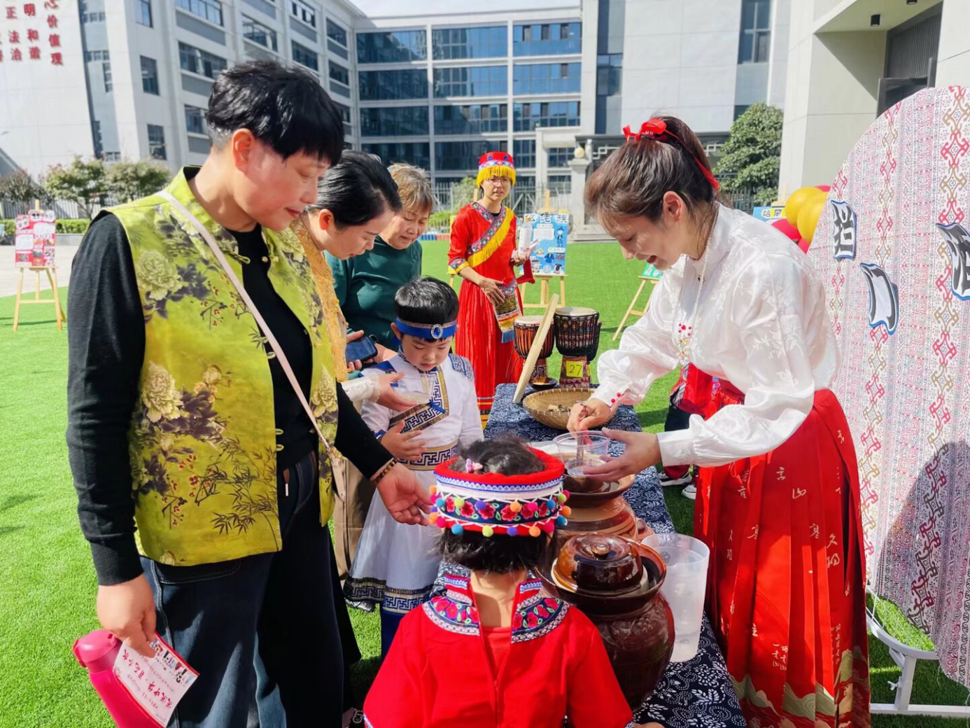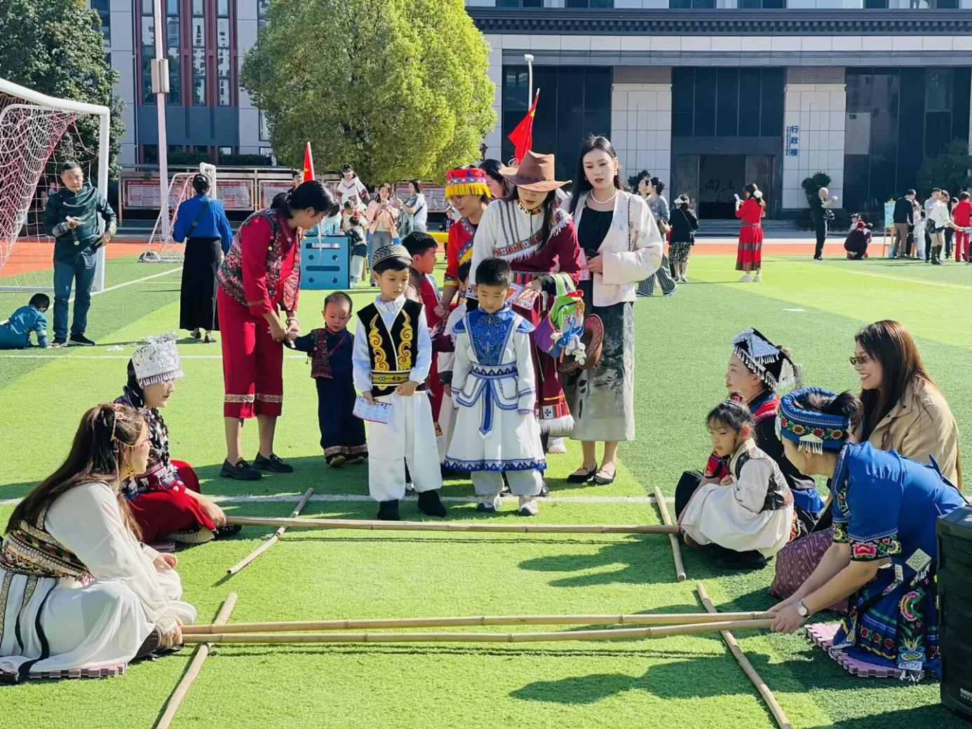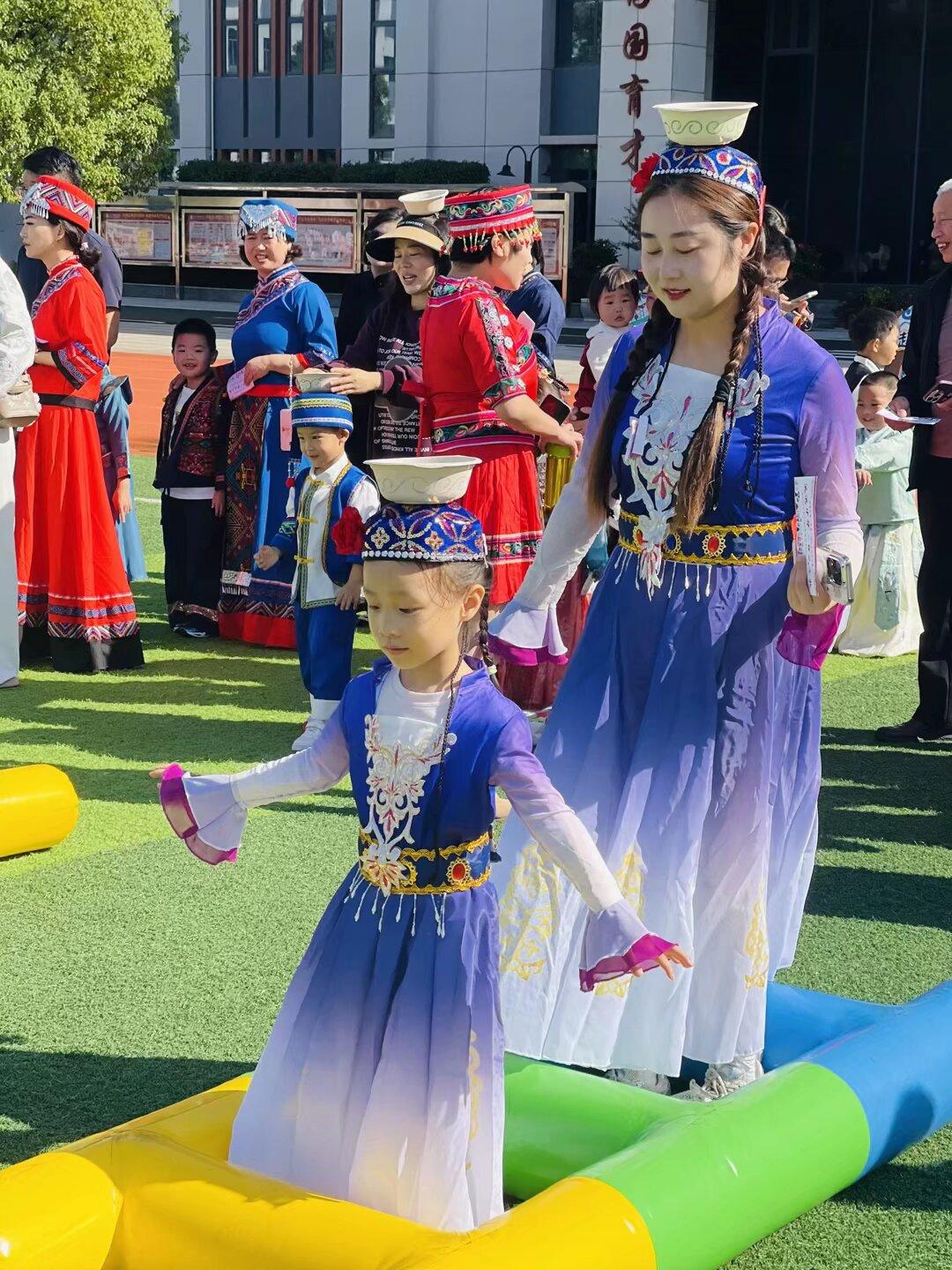亲子游园会气氛热烈,成为孩子们最期待的环节。场上设置了“藏族押加”“黎族竹竿舞”“蒙古族顶碗”等八个特色民族游戏区。家长与孩子们携手挑战,在欢声笑语中体验了多样的民族文化,并通过集章卡凝聚了亲子合力。