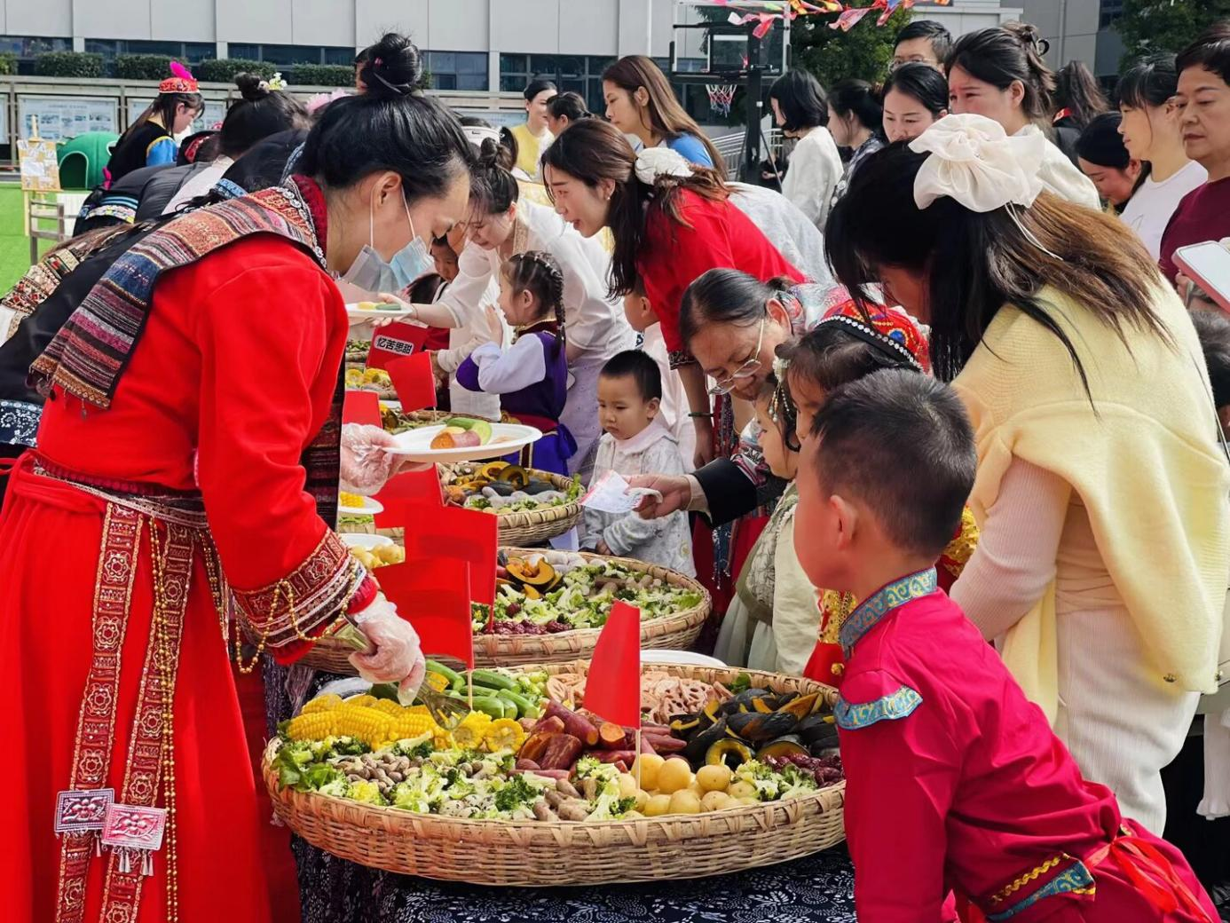活动伊始,民族服装走秀率先掀起高潮。家长与孩子们身着绚丽多彩的民族盛装自信登台,每一套服饰都展现着独特的文化内涵,现场掌声不断,相机快门声此起彼伏,生动呈现了“百花齐放”的动人场景。