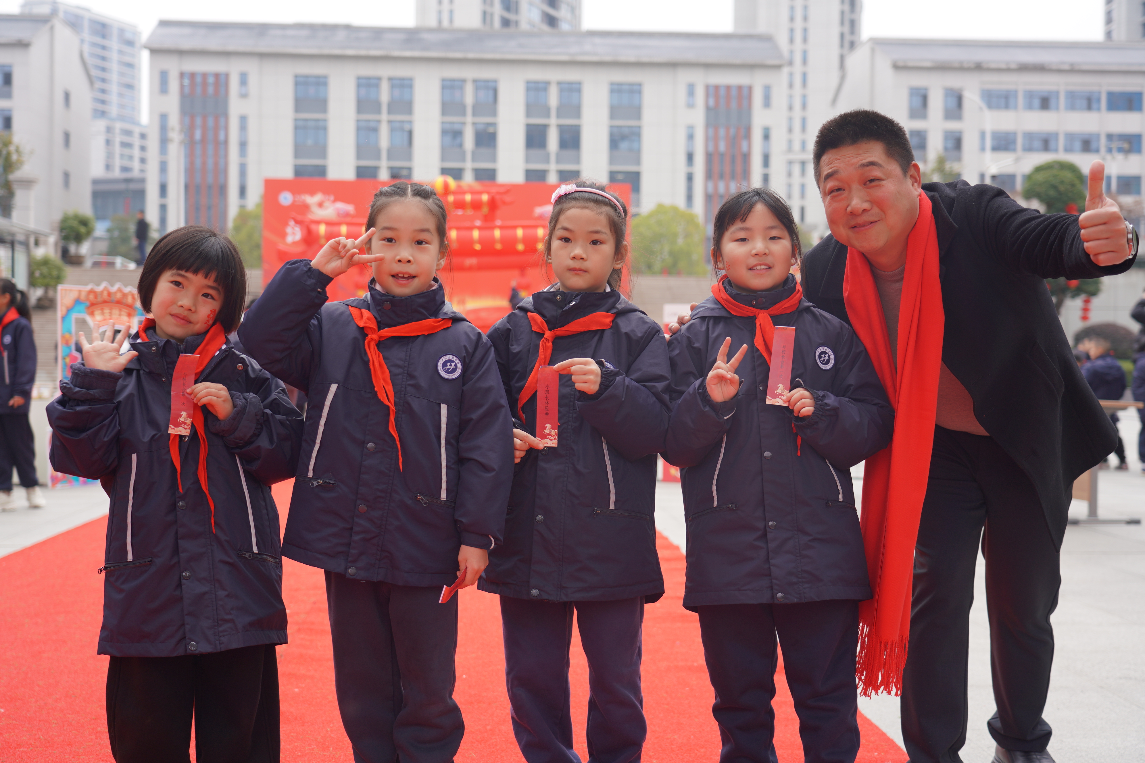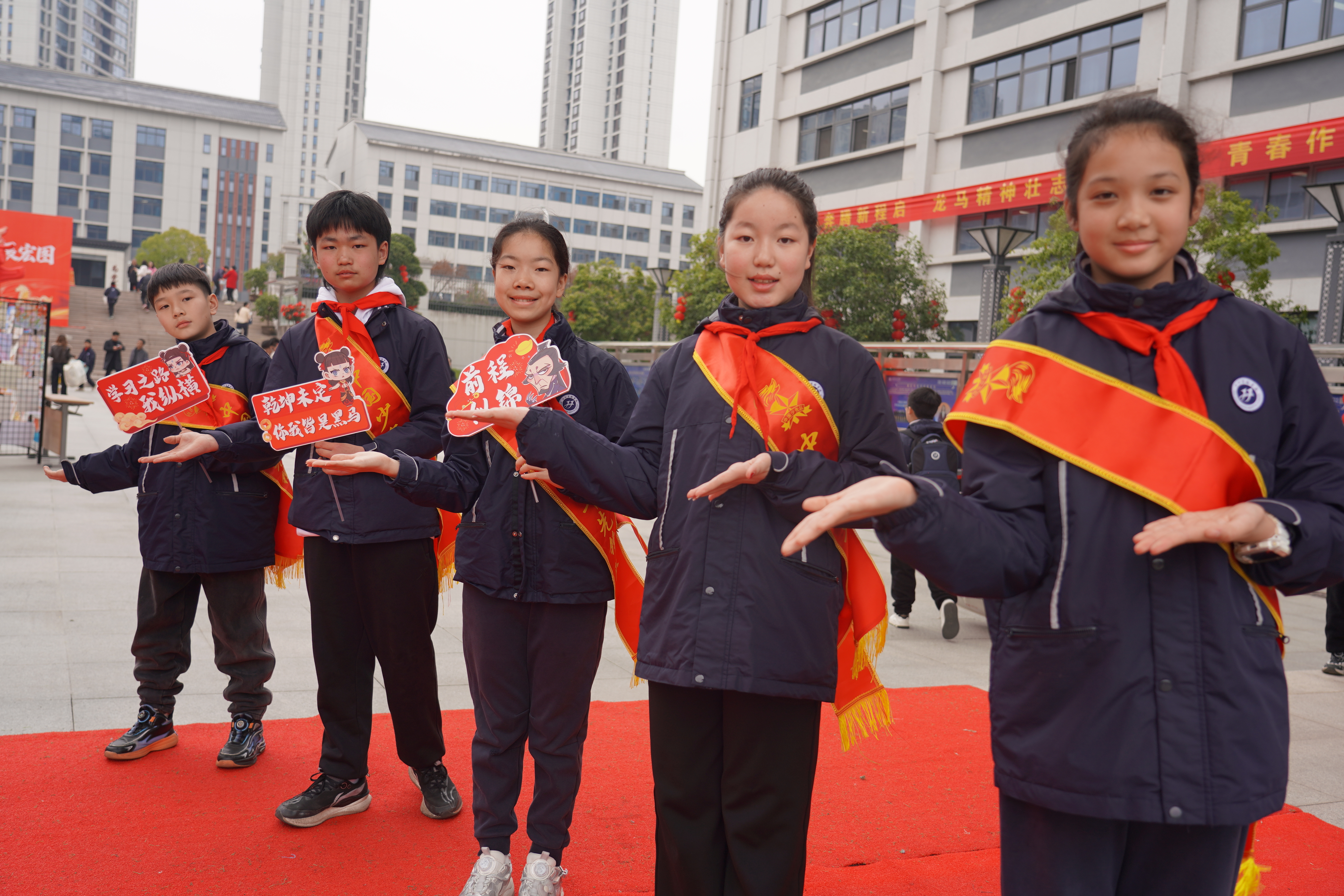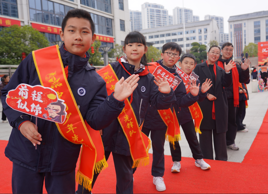 红毯两旁,优秀少先队员身着整洁校服,佩戴着鲜艳的红领巾,手持励志标牌,身姿挺拔、神情庄重,向每一位入校的学弟学妹庄严敬礼。他们稚嫩却坚定的身影,成为校园里最亮丽的一道风景线,传递着汉实大家庭的温暖与友爱,让红色基因在薪火相传中生生不息。
